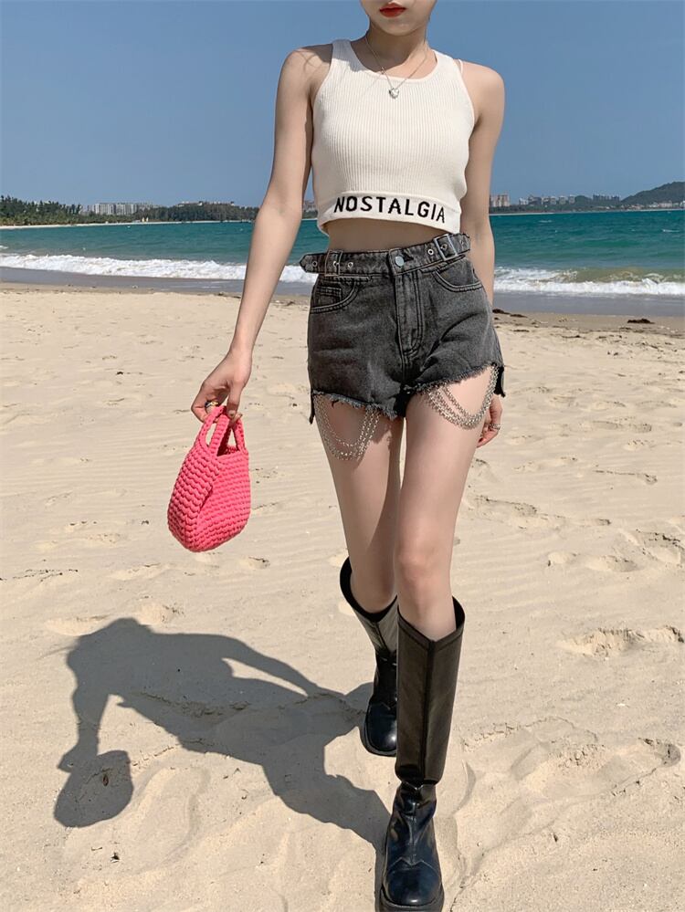 ダメージ加工とチェーンがおしゃれなデニムショートパンツ。