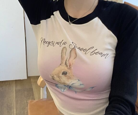 ウサギのプリントがキュートなショート丈長袖Tシャツです。