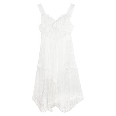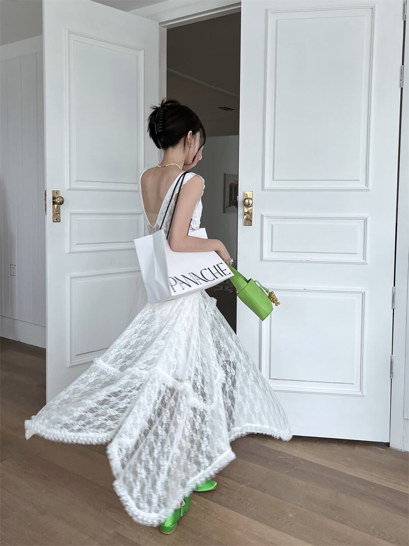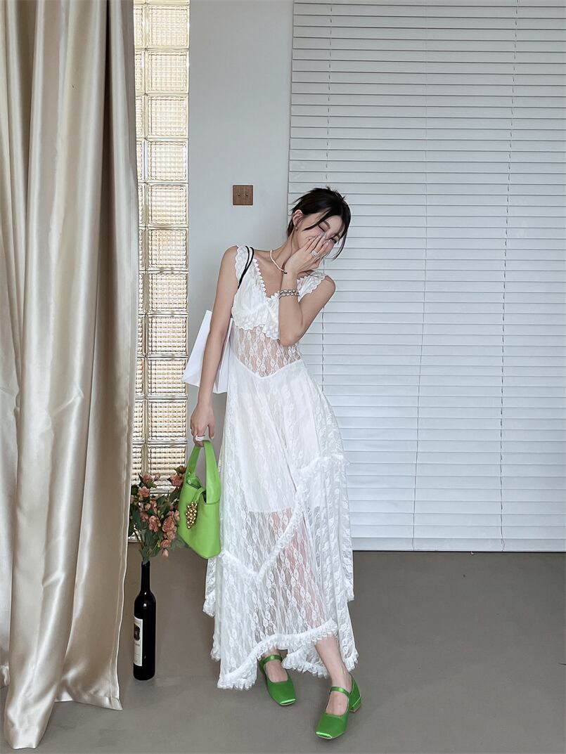 レースワンピース ワンピース ワンピドレス ロング丈 袖なし ノースリーブ Vネック Aライン レース フリル 透け感 シースルー 薄手 かわいい おしゃれ お洒落 大人可愛い ラブリー キュート ガーリー 主役級 存在感 夏 10代 20代 30代 レディース 女性用 お出かけ 女子会 休日 パーティー イベント リゾート 旅行 海 着回し 普段使い 重ね着 モテ S M L 白 ホワイト