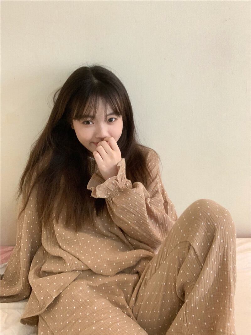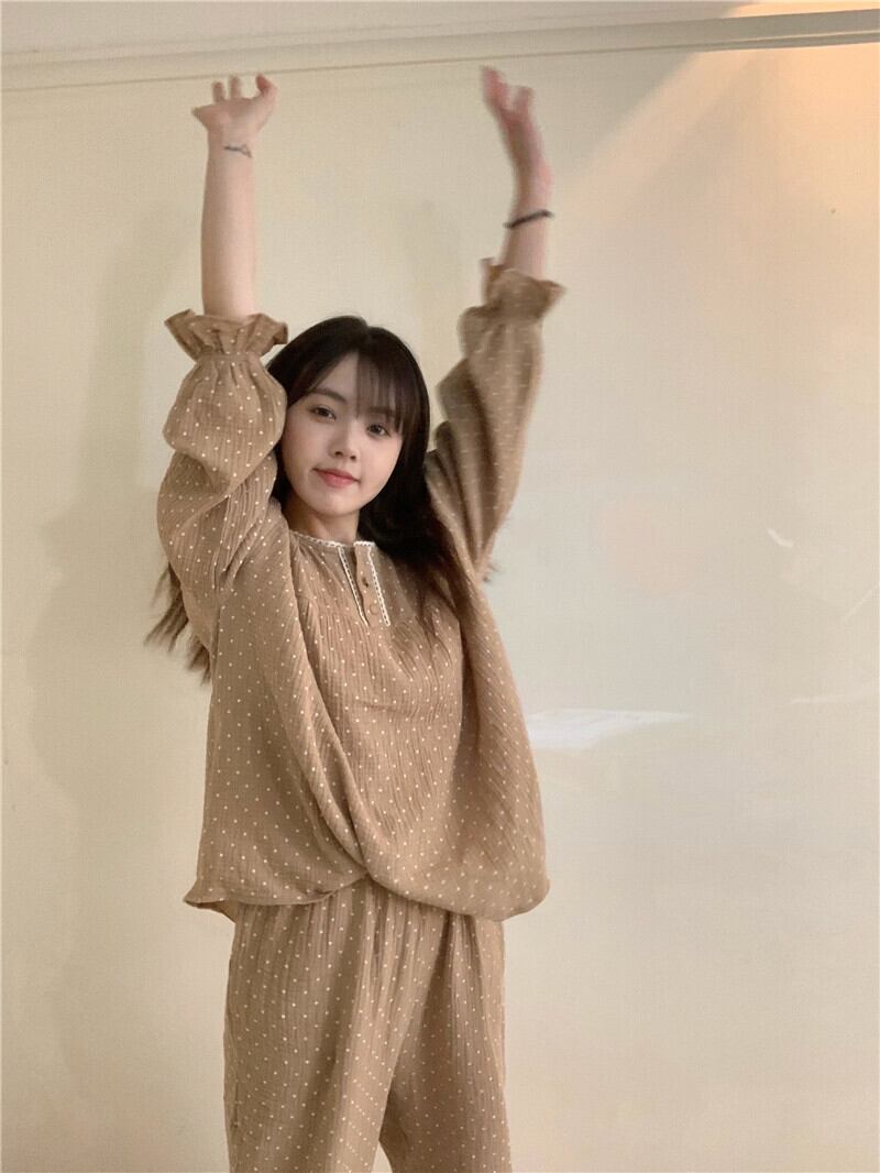 ドット柄パジャマ ルームウェア パジャマ 部屋着 寝巻き ナイトウェア ロング ロング丈 袖あり 長袖 ラウンドネック ハイウエスト ウエストゴム 綿 上下セット 2点セット ツーピース かわいい 大人可愛い きれいめ シンプル カジュアル 大人 上品 おしゃれ お洒落 大人可愛い 大人女子 こなれ感 ラブリー キュート ガーリー モダン 主役級 存在感 柄 ドット柄 水玉 春 秋 10代 20代 30代 レディース 女子会 お泊まり 休日 着回し 普段使い 重ね着 韓国系 オルチャン ブラウン ベージュ