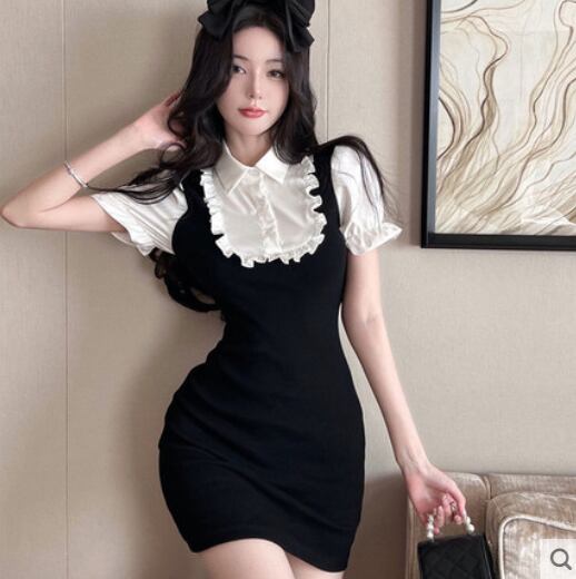 ウエイトレス風 重ね着風 コスプレ ワンピース ミニ丈 袖あり 半袖 襟付き フリル かわいい ラブリー ガーリー 存在感 無地 夏 10代 20代 レディース 女性用 女の子 お出かけ 休日 イベント 普段使い S M L 黒 ブラック