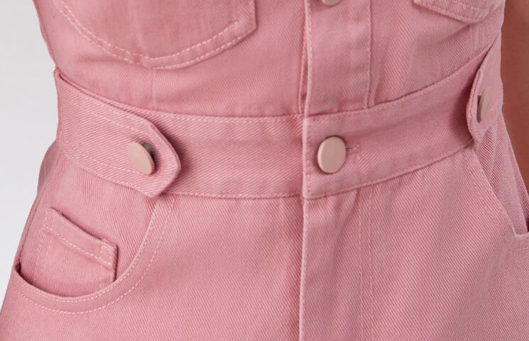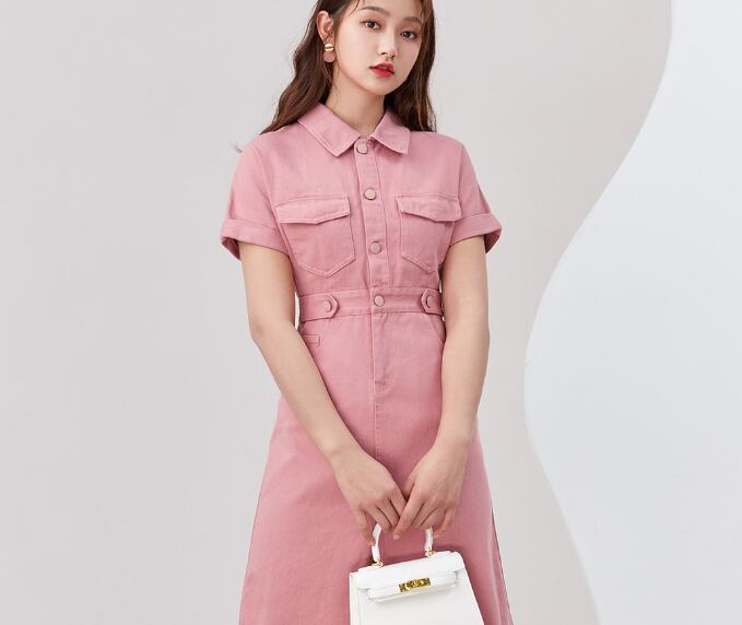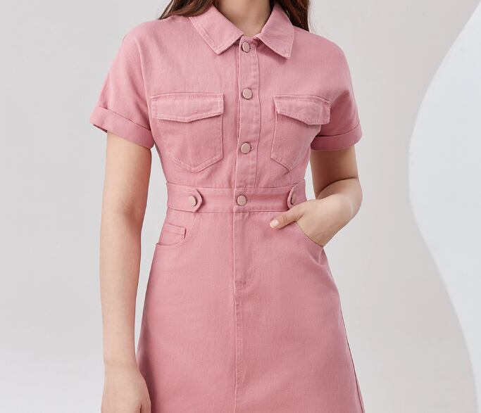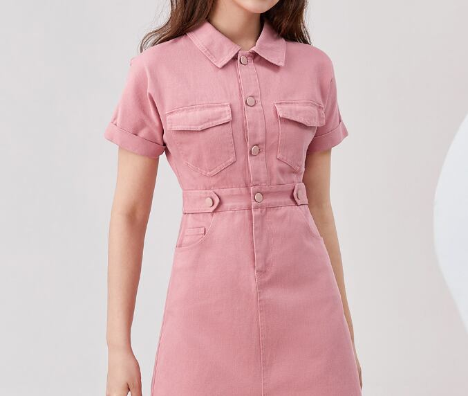 キュートなピンクからが目立つ半袖デニムワンピースです。