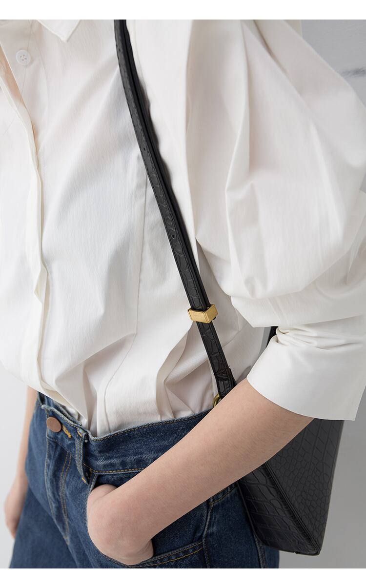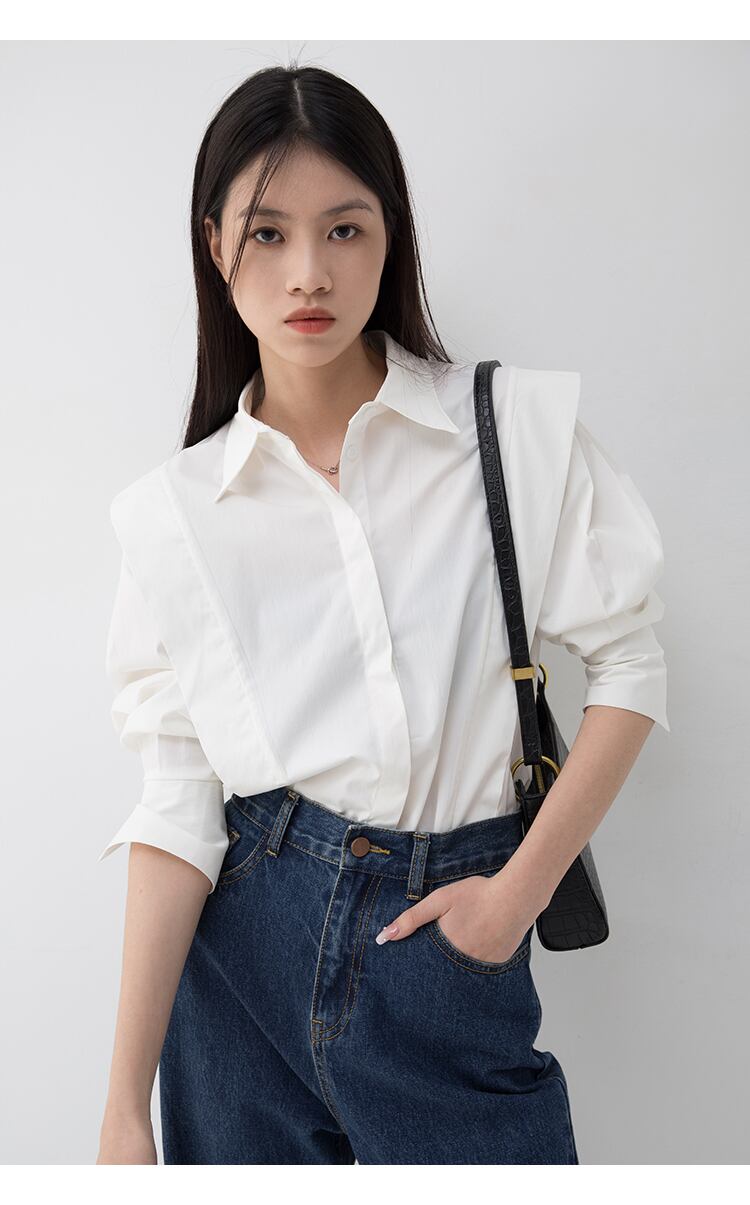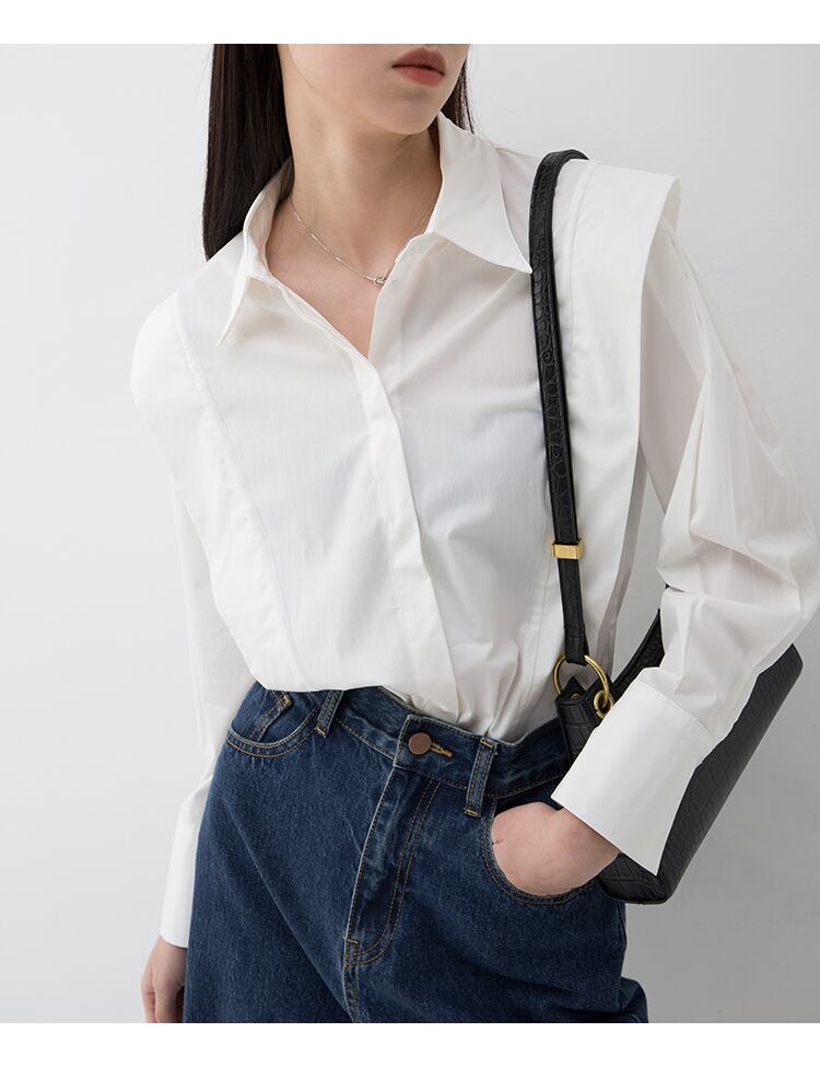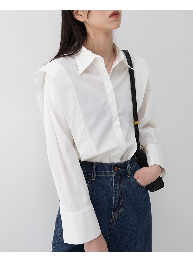 立体感を持たせた肩のタックデザインが特徴の長袖シャツ。