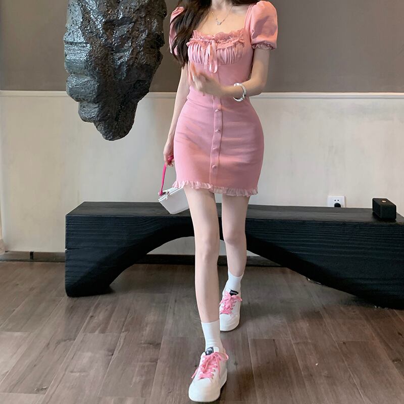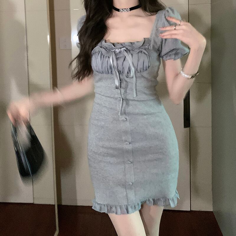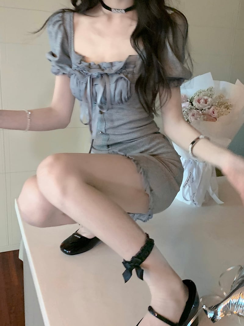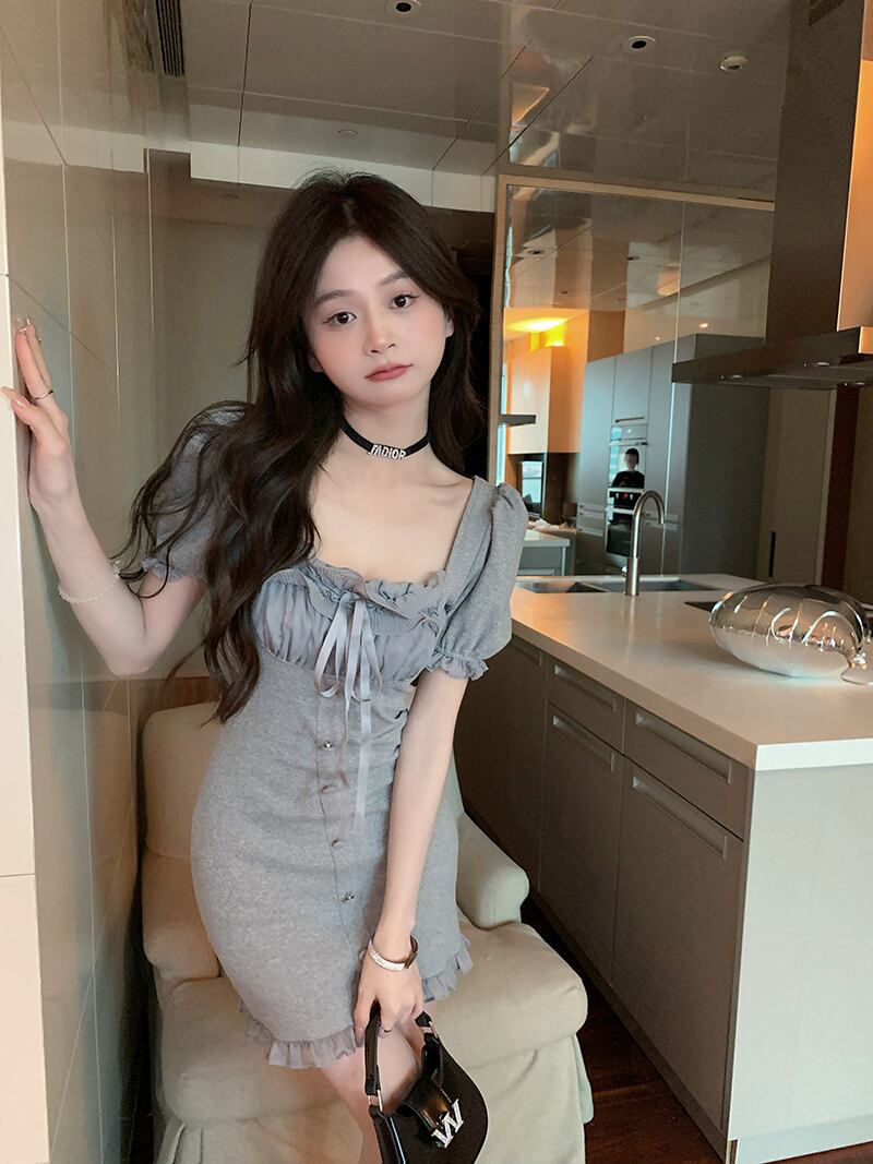 重ね着風 ワンピース ミニ丈 袖あり 半袖 パフスリーブ スクエアネック Aライン フリル リボン かわいい ラブリー キュート ガーリー 無地 夏 10代 20代 レディース 女性用 女の子 デート お出かけ 休日 普段使い 楽ちん モテ S M L 灰色 グレー ピンク