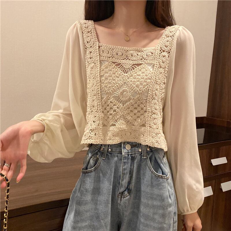 ドッキングブラウス トップス ブラウス 袖あり 長袖 スクエアネック 切り替えデザイン ドッキング クロシェ 綿 ポリエステル かわいい 大人可愛い きれいめ シンプル カジュアル 大人 上品 おしゃれ お洒落 大人可愛い 大人女子 こなれ感 ラブリー キュート ガーリー モダン 主役級 存在感 無地 春 秋 10代 20代 30代 レディース OL 通勤 学生 通学 デート お出かけ 公園デビュー 女子会 休日 着回し 普段使い 重ね着 韓国系 オルチャン 色展開 白 ホワイト アプリコット