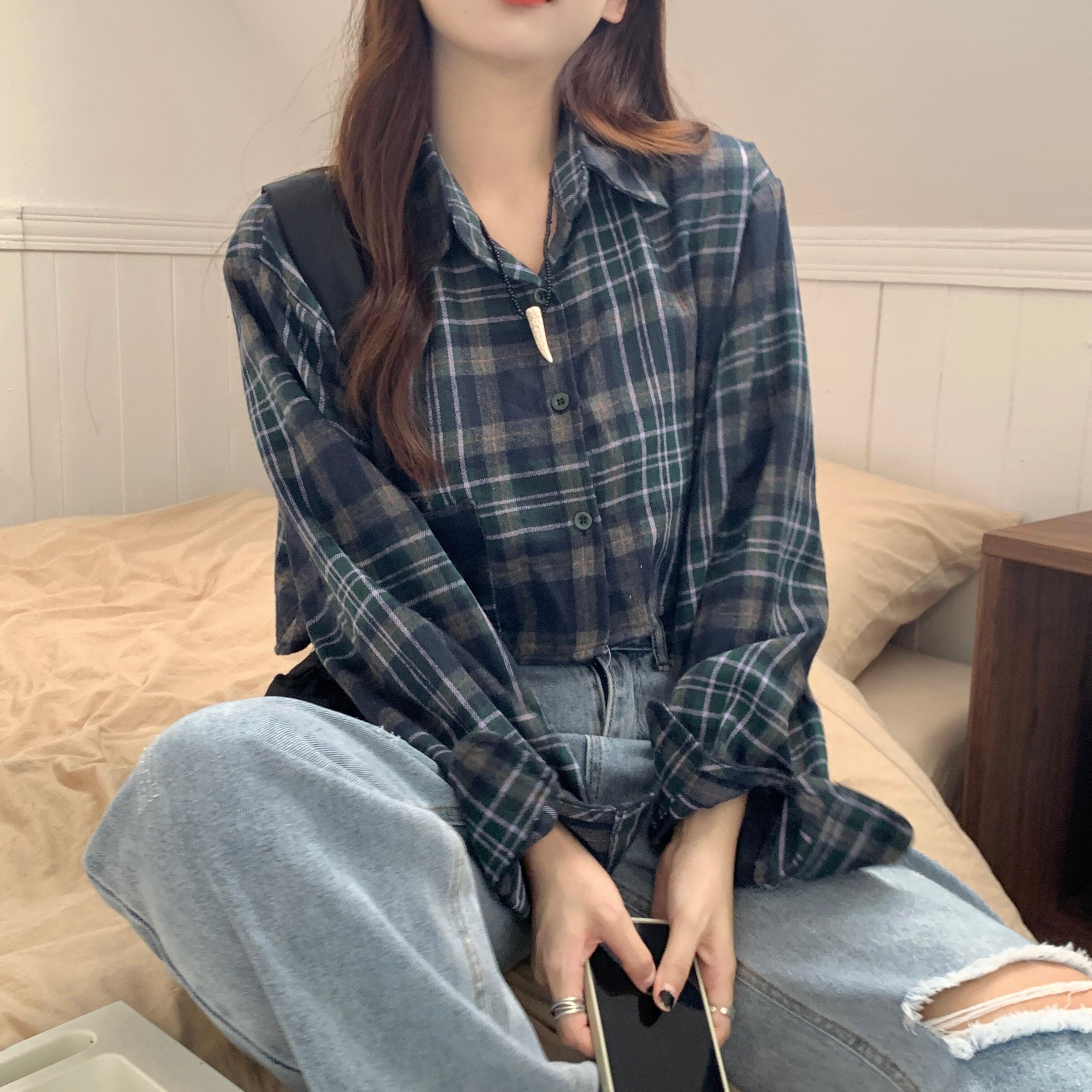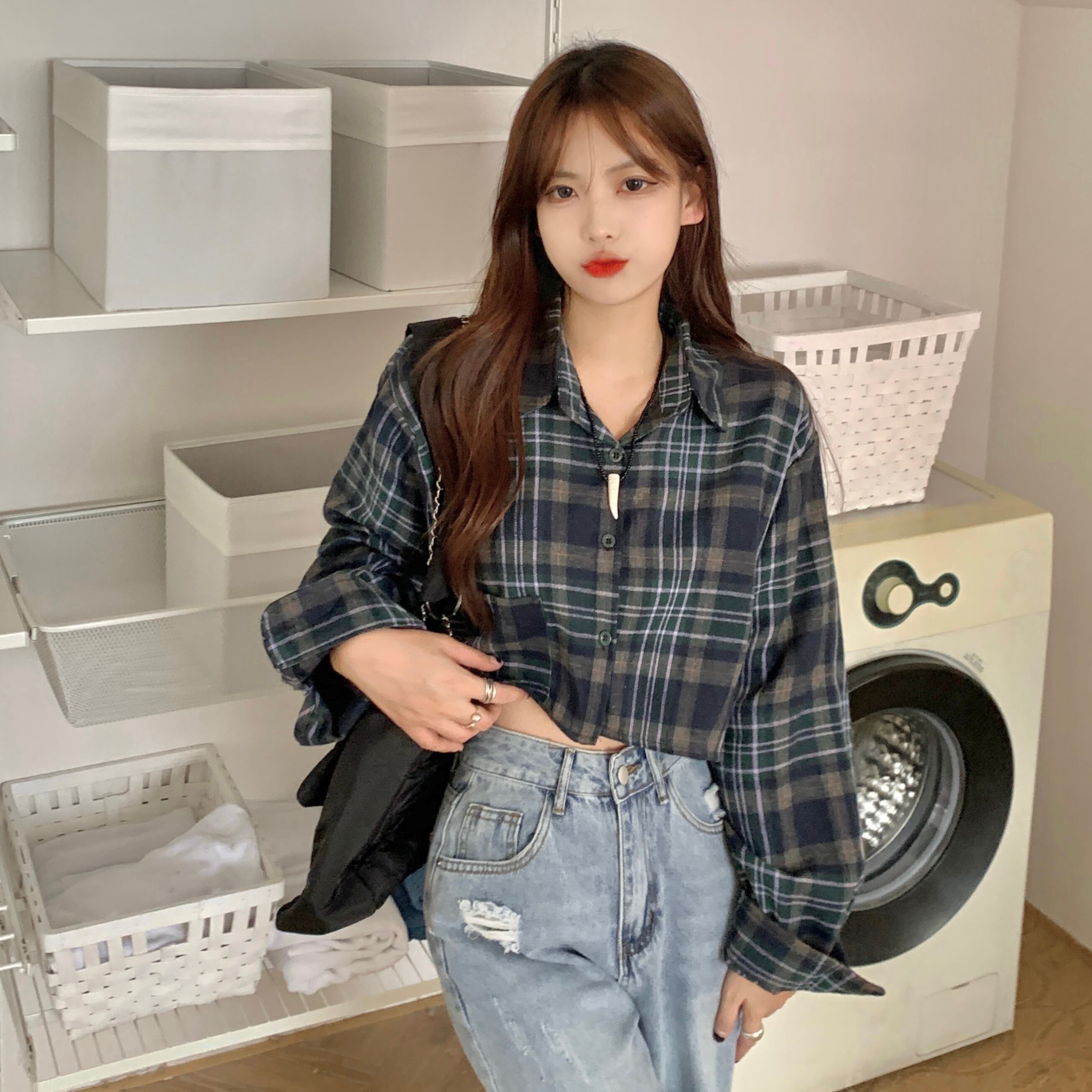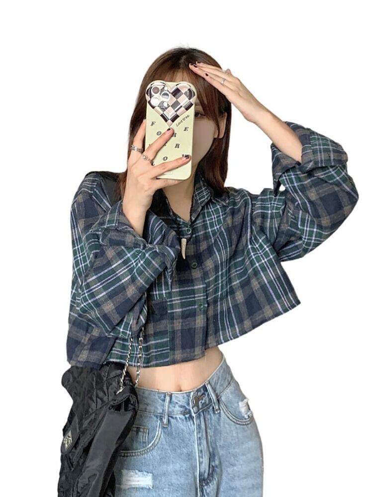チェック柄シャツ トップス シャツ ブラウス ショート ショート丈 袖あり 長袖 Vネック 襟付き 前開き かわいい 大人可愛い きれいめ シンプル カジュアル 大人 上品 おしゃれ お洒落 大人可愛い 大人女子 こなれ感 ラブリー キュート ガーリー モダン 主役級 存在感 柄 チェック柄 春 秋 10代 20代 30代 レディース 学生 通学 デート お出かけ 公園デビュー 女子会 休日 着回し 普段使い 重ね着 韓国系 オルチャン サイズ L XL 2XL 色展開 ネイビー