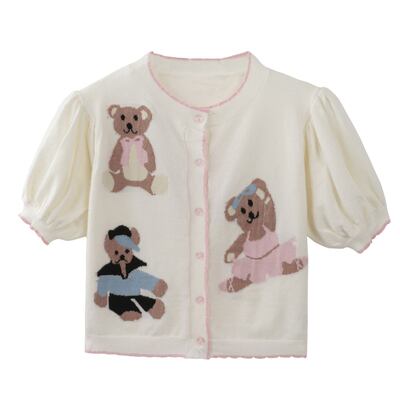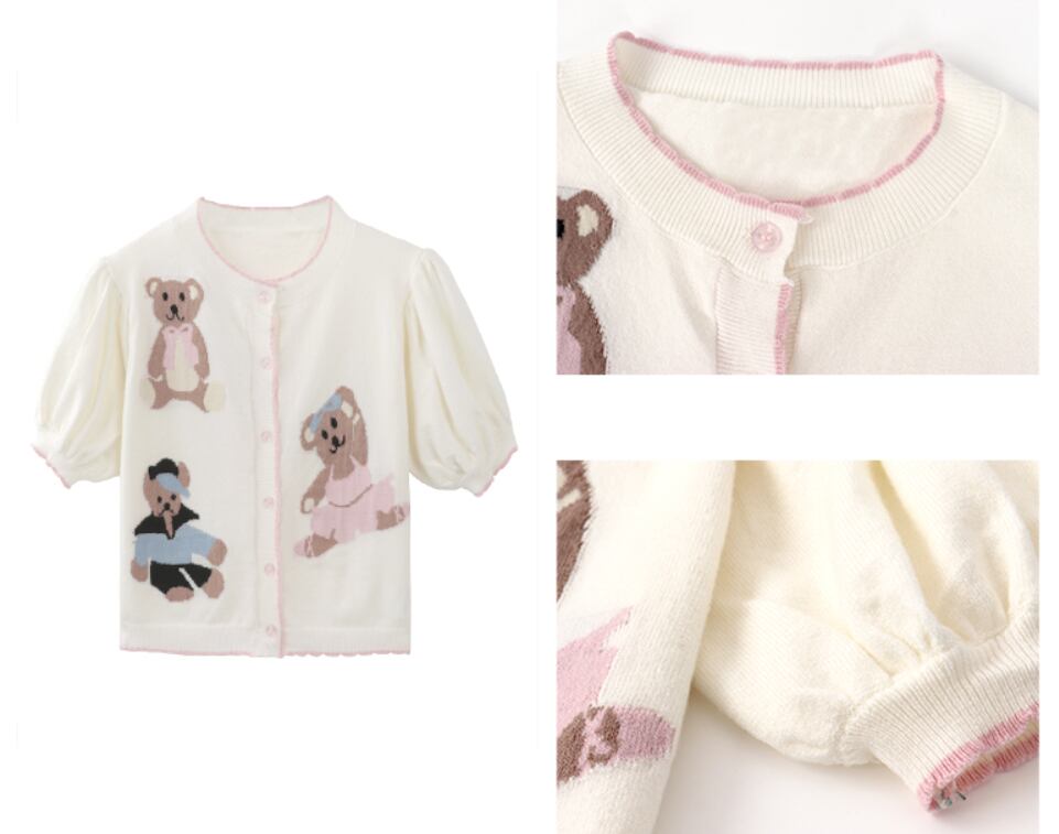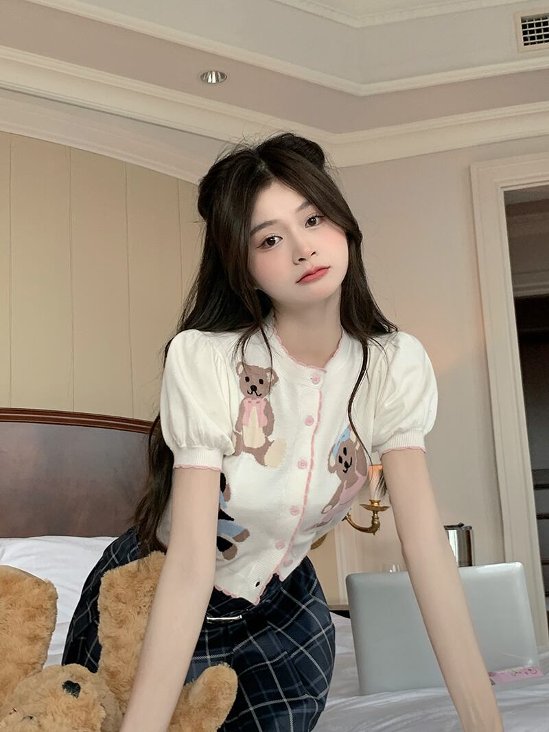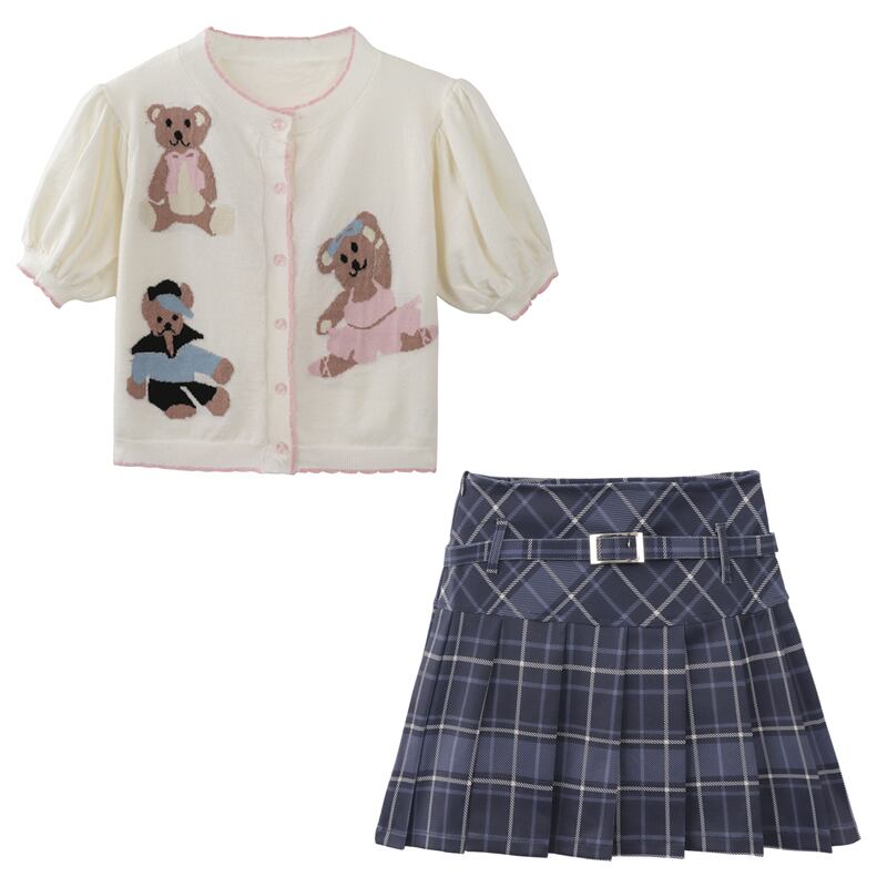 クマプリント トップス スカート カーディガン ミニスカート 袖あり 半袖 パフスリーブ ハイウエスト 伸縮性 上下セット 2点セット ツーピース かわいい キュート ガーリー チェック柄 10代 20代 レディース 女性用 女の子 デート お出かけ 休日 着回し 普段使い S M L