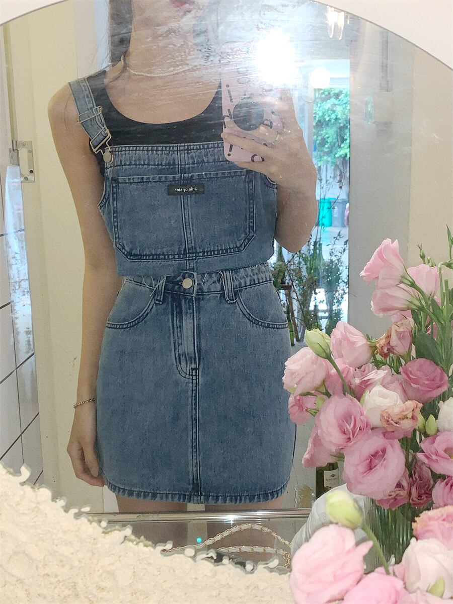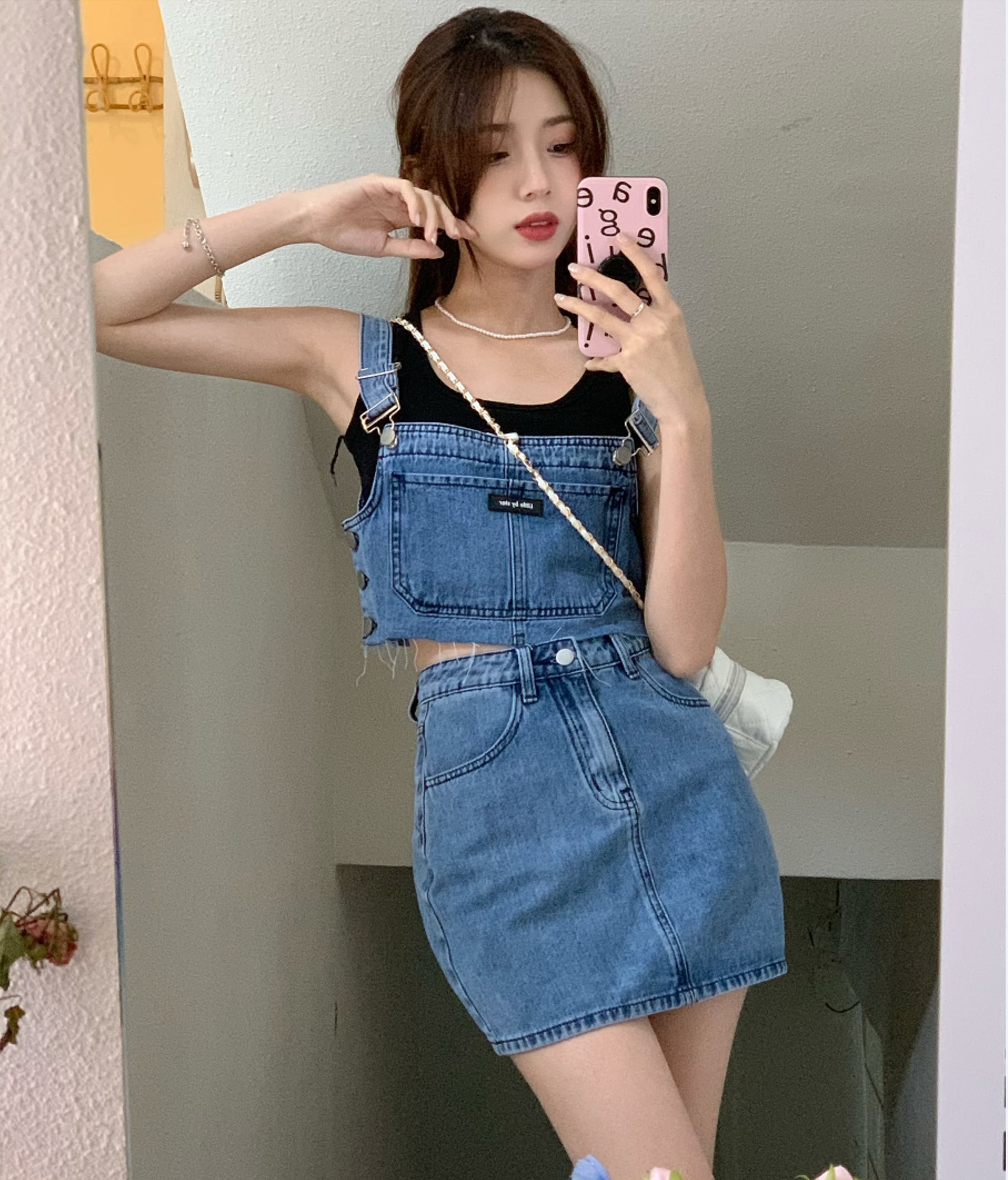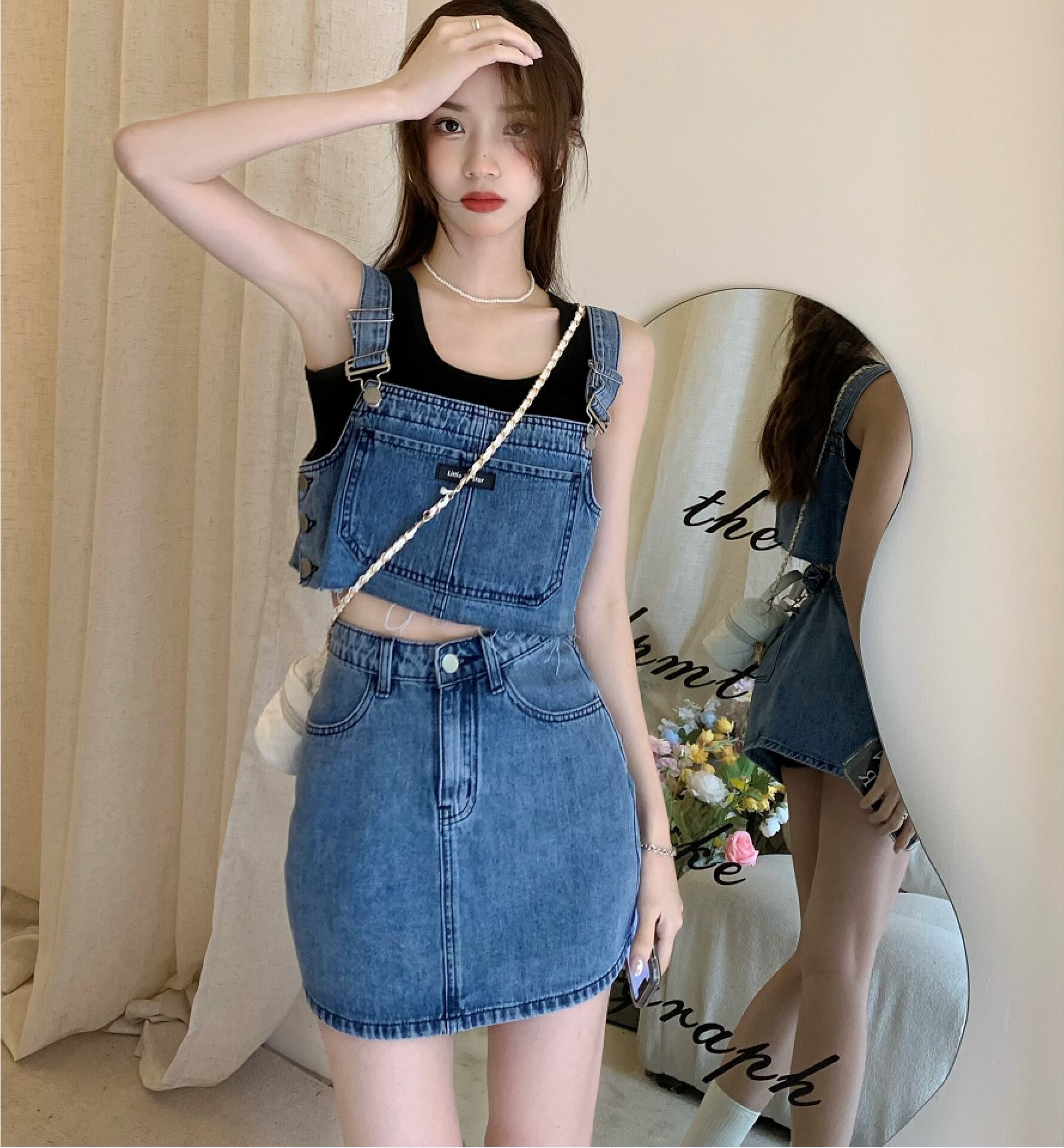 クロップ丈のトップスとスカートのデニムセットアップ。