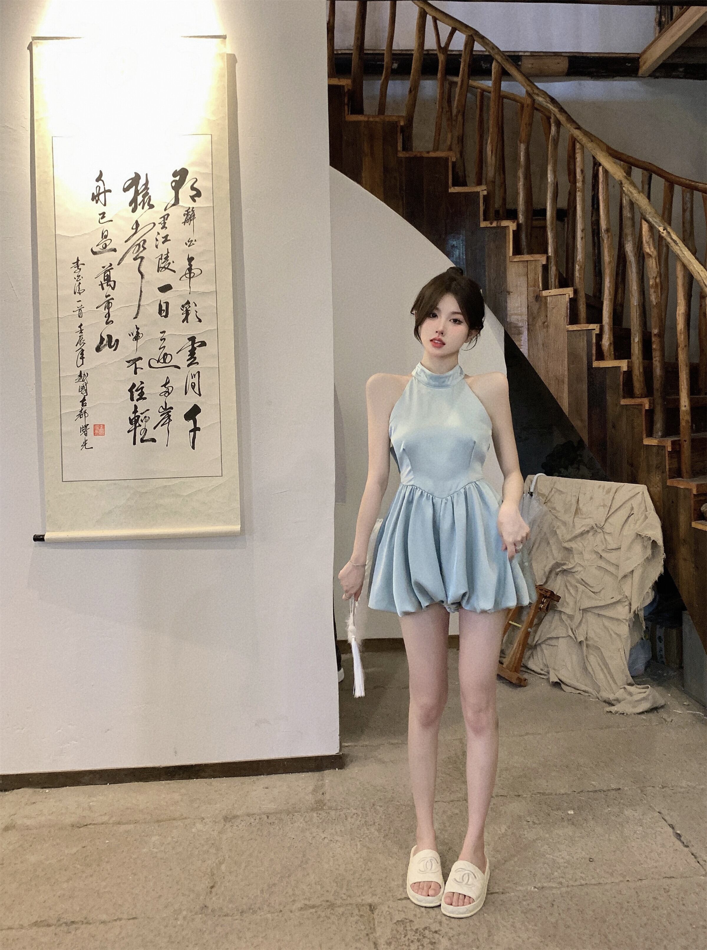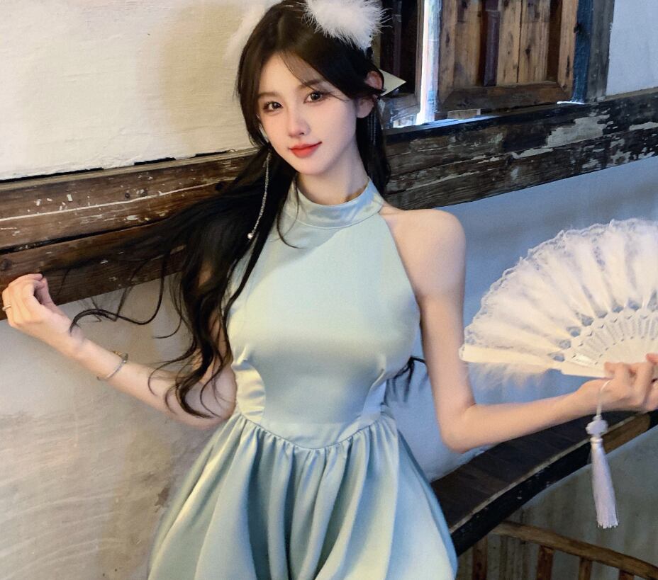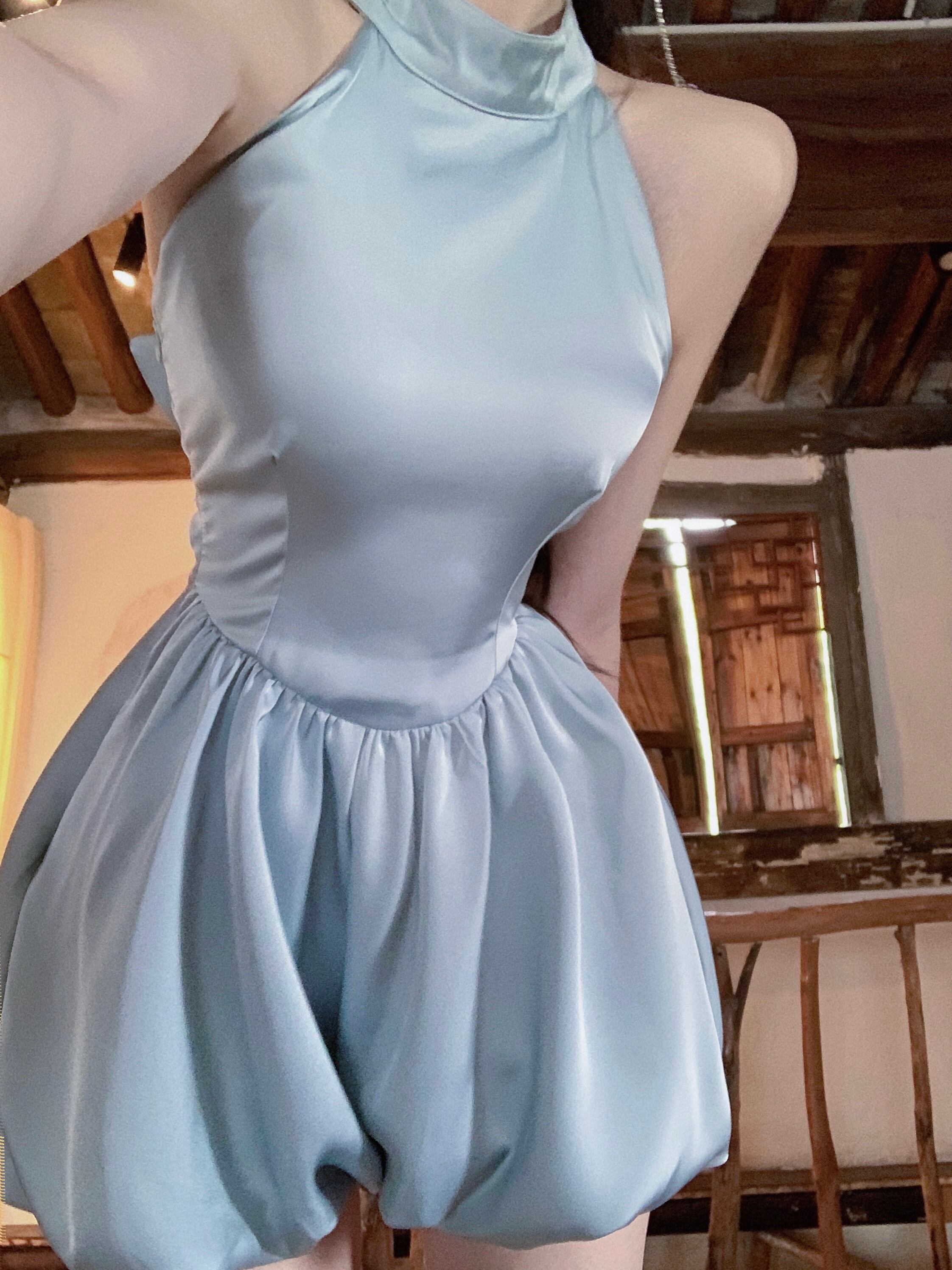 バックリボン サテン ワンピース ミニ丈 袖なし ノースリーブ ホルターネック ウエストマーク かわいい おしゃれ お洒落 レトロ 大人可愛い とろみ感 無地 夏 10代 20代 レディース 女性用 パーティー イベント 着回し 重ね着 S M 青 ブルー