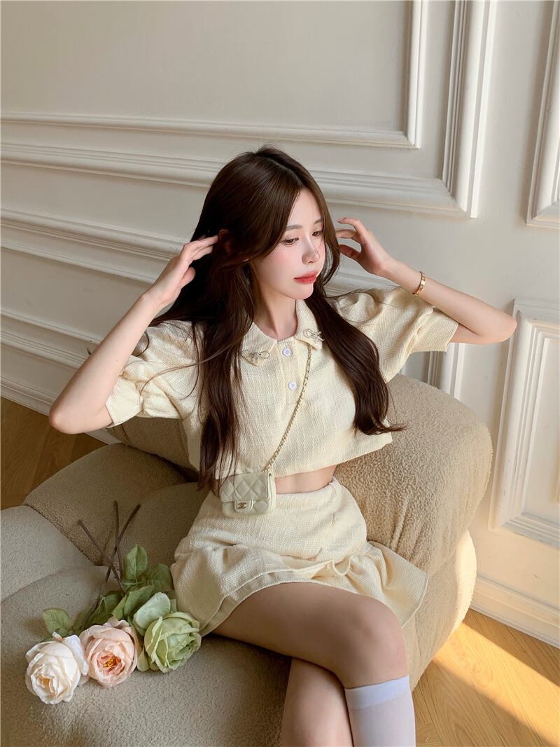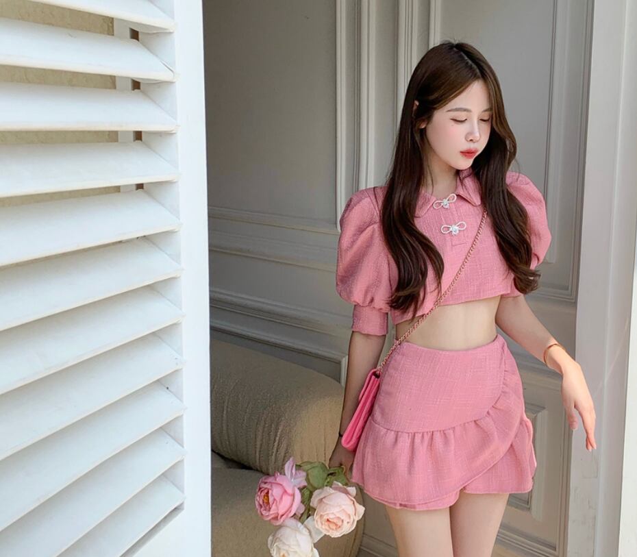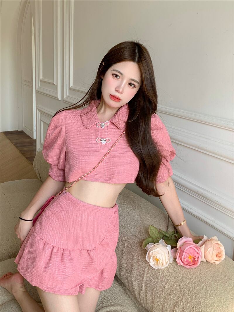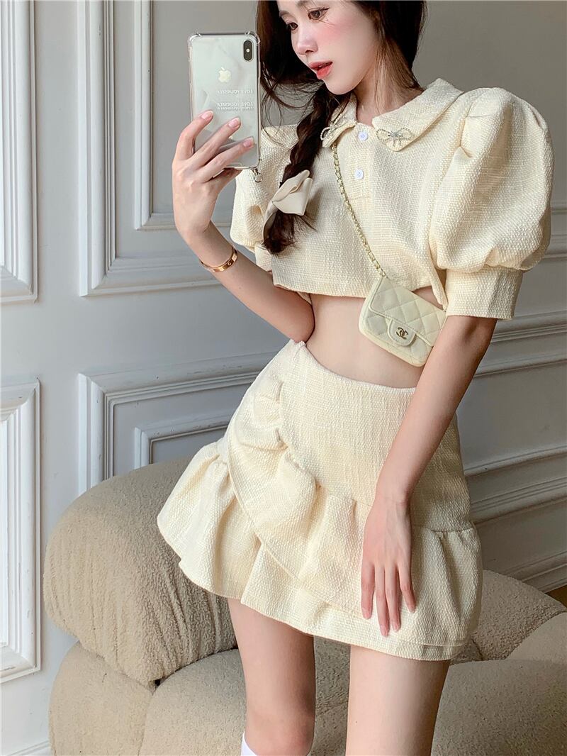 ティアードデザイン セットアップ ミニ丈 ショート丈 袖あり ボリューム袖 パフスリーブ 襟付き 上下セット ツーピース かわいい シンプル キュート 個性的 無地 春 夏 10代 20代 レディース 女性用 デート お出かけ 女子会 休日 着回し 普段使い モテ S M ピンク アプリコット