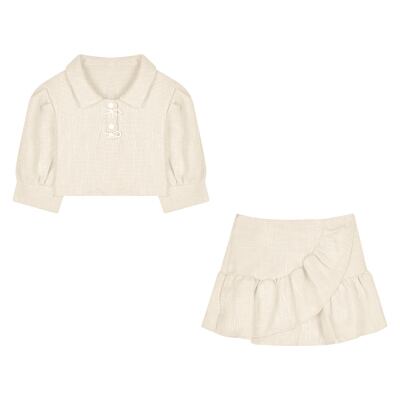 ショート丈トップスとティアードスカートのツーピースセット。