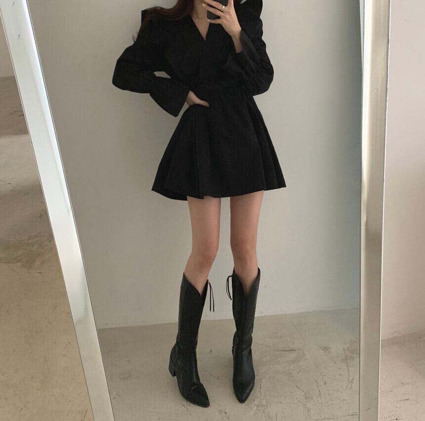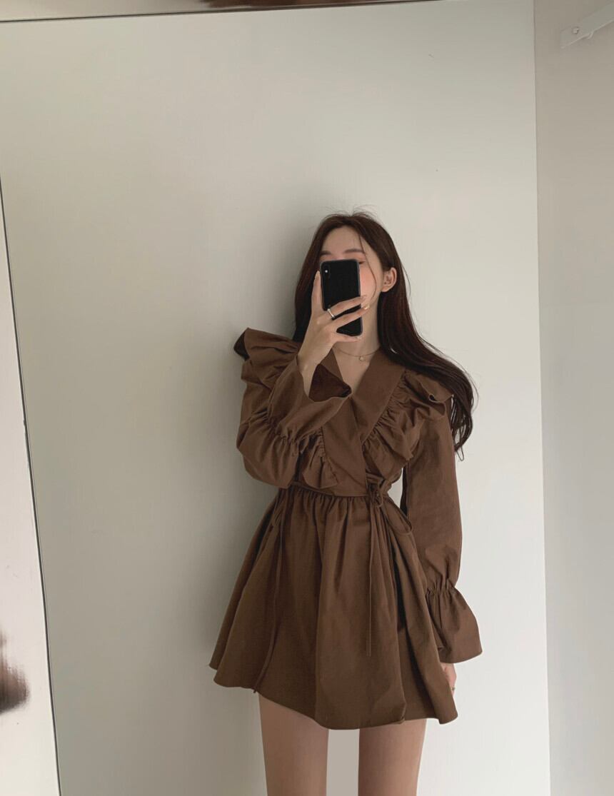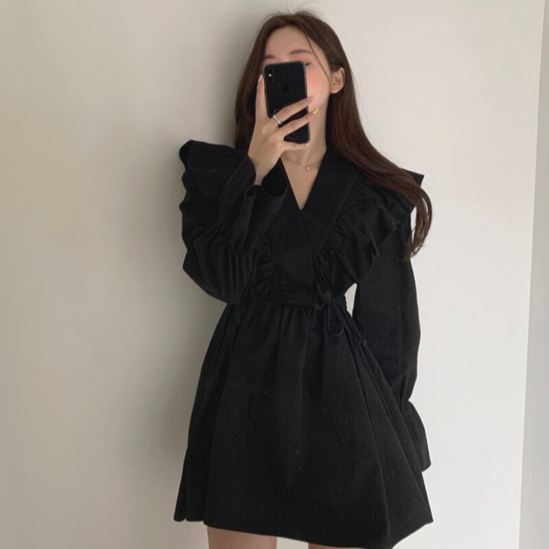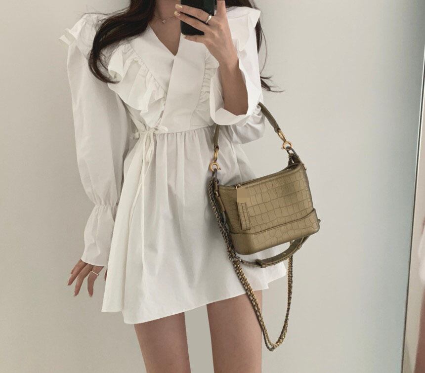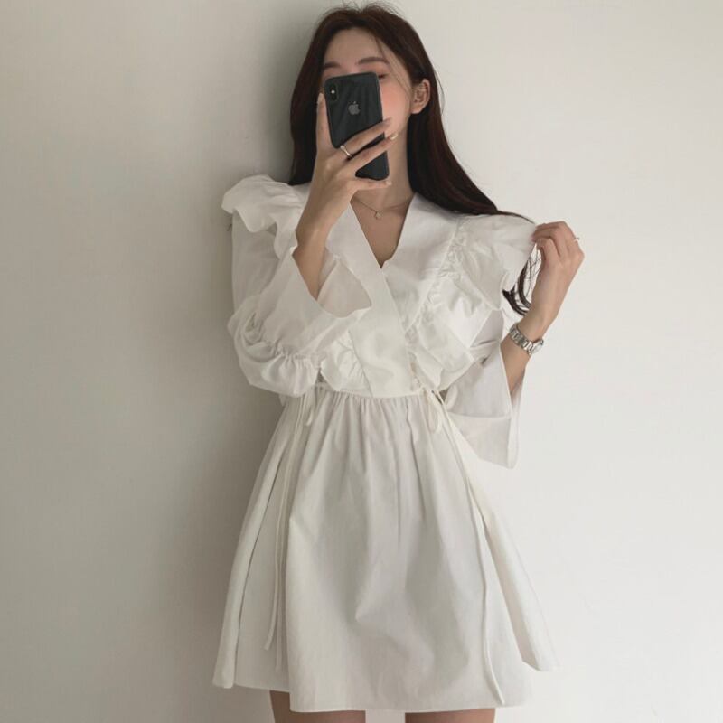 春秋フレンチ韓ハスリーフサイドストラップウエスト長袖ドレスレディースドレス ワンピース シャツワンピース ショート丈 長袖 Vネック xライン シフォン フリル ウエストマーク ウエストリボン ハイウエスト 大人可愛い シンプル カジュアル おしゃれ 大人女子 ラフ ラブリー キュート ガーリー 無地 春 秋 10代 20代 30代 OL 通勤 学生 通学 デート お出かけ 女子会 お泊まり 休日 旅行 普段使い S M L XL ホワイト ブラック ブラウン