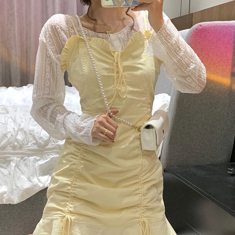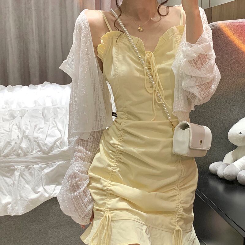 透かし編み花柄サマーカーディガンとキャミワンピースのセット。